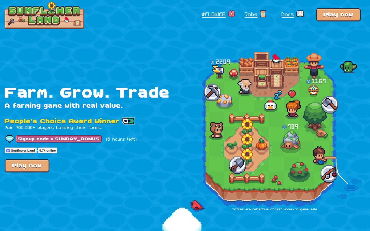 Sunflower Land topping our list as the most approachable “play-to-own” alternative for players who like progression without pressure. This cozy farming game operates with a player-driven crafting loop where resources, upgrades, and trading matter from day one. Notably, Sunflower Land excels in pick-up-and-play sessions, so you can progress daily without committing to long raids or heavy guild schedules.